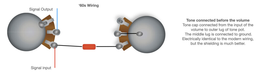 The modern, or ‘standard’ tone pot wiring is electrically the same as the 60’s wiring but the shielding characteristics aren’t as good. With the tone pot connected to the input of the volume pot, you will find that a lot of the treble signal is lost as the volume pot is turned down. The most common solution to bring the treble signal back and to give you a more even volume drop is to add a treble bleed circuit between the input and output lugs of the volume pot.